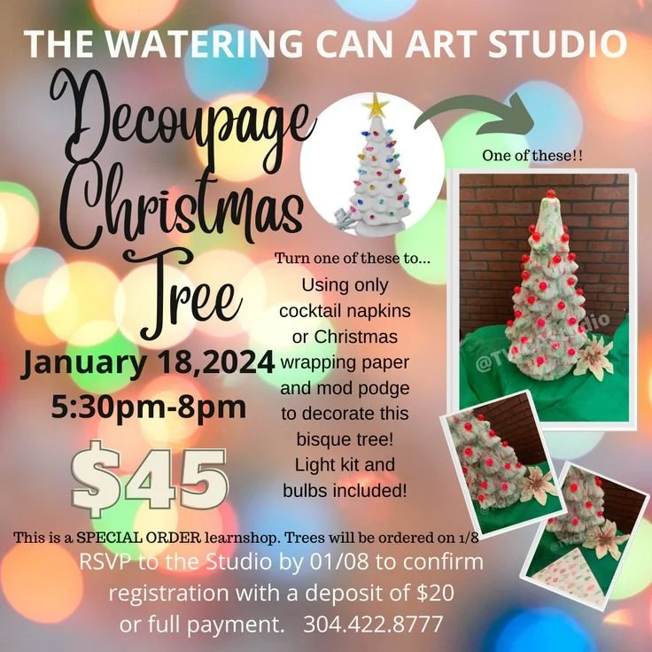 This event is SPECIAL ORDER so you have to RSVP by 1/08 so we have enough trees for everyone!! Call the Studio (304)422.8777 to put down a $20 deposit to hold onto your tree!!