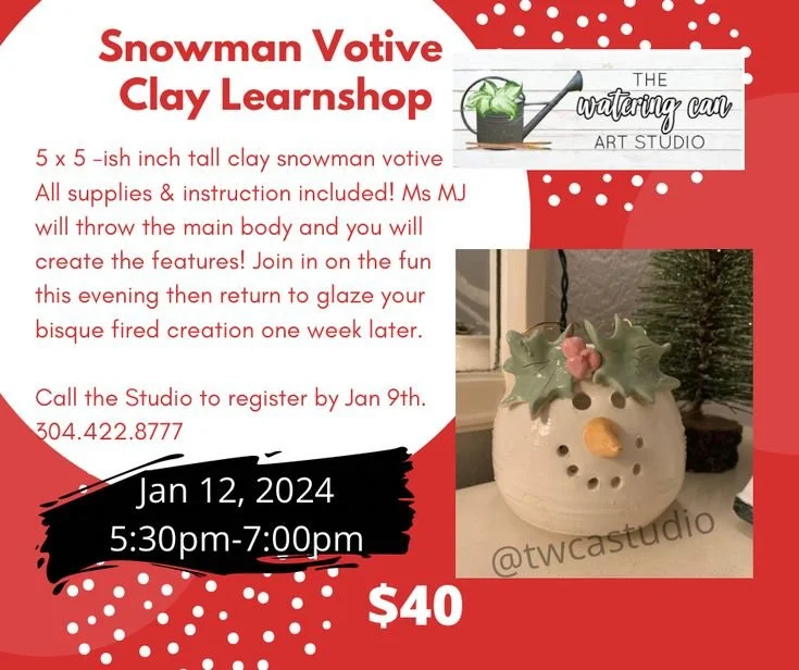 This month we will be making a 5x5 Clay Snowman Votive!! Ms. MJ will throw the main body and you will make all the features!! $40 per person!!!
